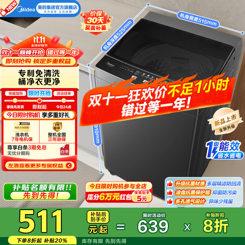 包邮 美的(Midea)全自动波轮洗衣机 8kg公斤家用电器品质电机智能预约立方内桶水电双宽一级能效 MB80V37T